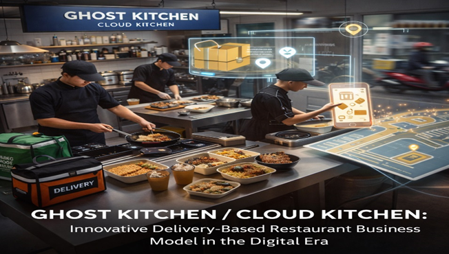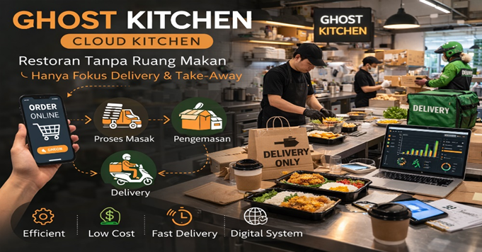 Perkembangan teknologi digital dan perubahan perilaku konsumen telah membawa transformasi besar dalam industri restoran. Salah satu inovasi yang semakin populer dalam beberapa tahun terakhir adalah konsep Ghost Kitchen atau Cloud Kitchen. Model bisnis ini merupakan restoran yang beroperasi tanpa ruang makan (dine-in) dan hanya melayani pesanan melalui layanan delivery atau take-away. Konsumen biasanya melakukan pemesanan melalui aplikasi pemesanan makanan online seperti platform delivery atau website restoran. Model bisnis restoran baru yang hanya fokus pada delivery tanpa dine-in. Konsep ini berkembang pesat karena meningkatnya permintaan layanan pesan antar makanan.